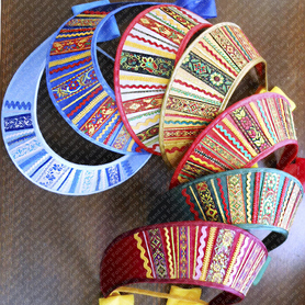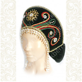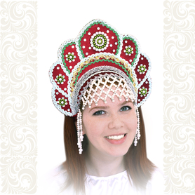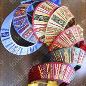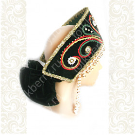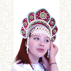 Кокошник выполнен из бархата (или атласа, на Ваш выбор), бусин белого и золотого цвета, пайеток, жаккардовой тесьмы, контрастной по цвету к фону.