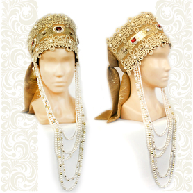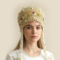 Кокошник выполнен из бархата (или атласа, на Ваш выбор), бусин белого и золотого цвета, пайеток, жаккардовой тесьмы, контрастной по цвету к фону.