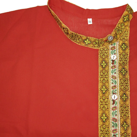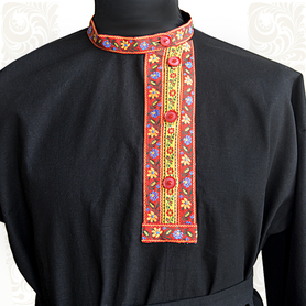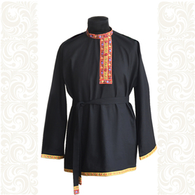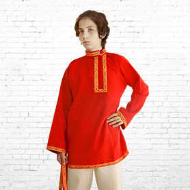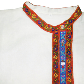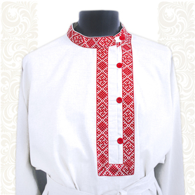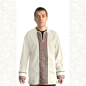 Рубаха для мужчин и детей модели «Николай» предназначается для традиционных русских праздников и мероприятий. Наряд сшит из габардина, белоснежного цвета. Орнамент «хохлома» на вороте, груди, манжетах и по низу сделан несмываемой краской – желто-зеленого цвета и по его контуру струится изящная тесьма золотистого цвета. Краска не смывается при стирке, не линяет, поэтому орнамент остается стойким на протяжении всего срока эксплуатации. К рубахе прилагается пояс с рисунком на концах.