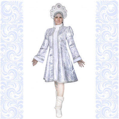 Костюм выполнен из парчи бело-серебристого цвета. Костюм декорирован искусственным мехом белого цвета. Застежка - потайные кнопки. Силуэт - приталенный, сзади кулиска для регулировки талии. Красивый пышный рукав. Отделка - серебристая ажурная тесьма. Длина шубки по спинке 93-98 см (от седьмого шейного позвонка до низа изделия).