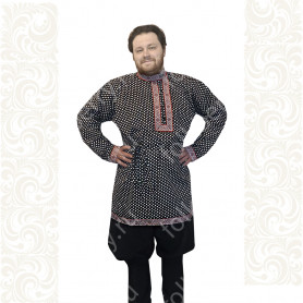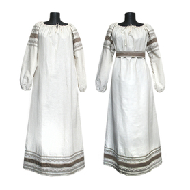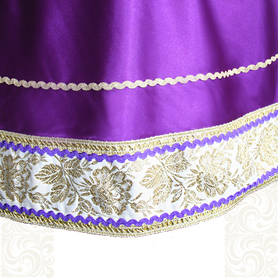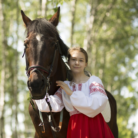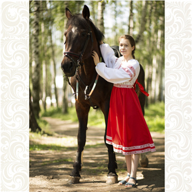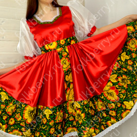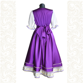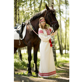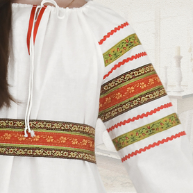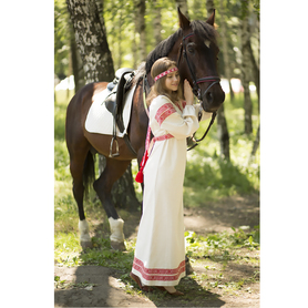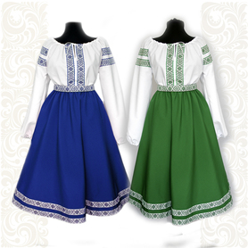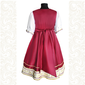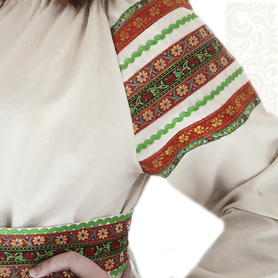Платье «Дмитра» – отличный вариант наряда для тематических праздников  в детском саду и школе, православных и других мероприятиях. Платье  хорошо садится по фигуре и удобное в носке, благодаря регулируемой горловине, рукаву реглан, длинному поясу.  Юбка (почти солнце) длиной немного ниже колена эффектно смотрится при исполнении танца. Талия  немного завышена. Декор платья - жаккардовая тесьма с обережными символами. Платье шьется из габардина, из матовой, немнущейся ткани ярких цветов.