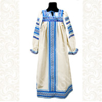 Декор платья - жаккардовая тесьма со славянскими символами. Талия немного завышена, пояс в комплекте.