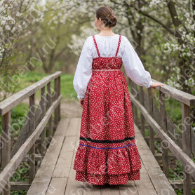 Платье Олеся удлиненное ( миди, до щиколотки) станет отличным вариантом сценического костюма! Сочетание белого и красного цвет, длинная юбка  придают платью торжественности. Свободный силуэт, рукав реглан, регулируемая горловина добавляют вещи комфортности.