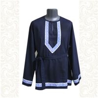 Фасон рубахи удобен и  не ограничивает движения. Жесткий воротник, пуговицы отсутствуют, рукав втачной, немного спущенный, свободный, длина рукава примерно до локтя. По бокам внизу разрезы. К рубахе прилагается пояс. Декор на груди выполнен из жаккардовой тесьмы в натуральном цвете. Для подбора правильного размера, в заказе, пожалуйста, пишите рост, обхват груди и талии.