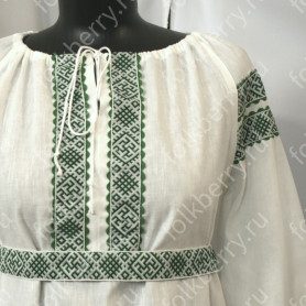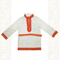 Рубаха "Василёк" выполнена из габардина белого оптического цвета. Декором косоворотки стали большие по размеру вставки из хлопка с цветочным рисунком в сине-голубом цвете и вьюн синего цвета. С Косоворотка без воротника-стойки удобна при надевании на верхнюю одежду (на зимних мероприятиях). Косоворотка "Василек" и сарафан с блузой "Гжель" подойдут для участников одного ансамбля.