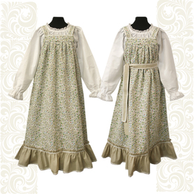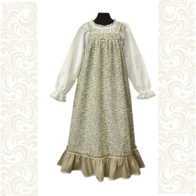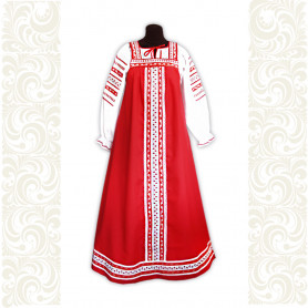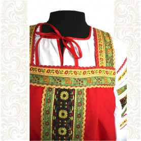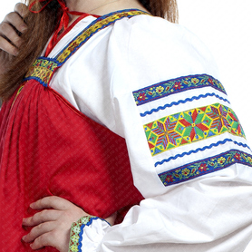 Эта традиционная женская рубаха ( длинная туника с поликами под мышками, с разрезами по бокам, с поясом) из белого льна. Декорирована по низу рукава, подолу и на груди широкой жаккардовой тесьмой с гжельскими мотивами сине-голубого цвета на белом фоне.