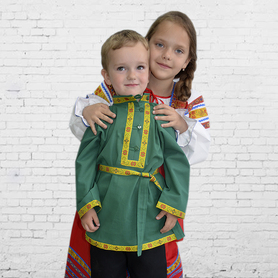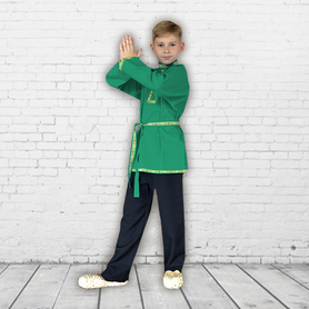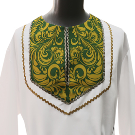Мужская рубаха «Истоки» выполнена в свободном крое, подходящим любой фигуре. Сшита из льняной ткани. Модель имеет втачной, короткий рукав, ворот с завязками, с  поясом (кушаком) из ткани с тесьмой. По низу, вороту, рукавам изделия  декор из жаккардовой тесьмы со славянским рисунком- оберегом.