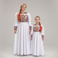 Выполненный в православном стиле сарафан с блузой «Русь» сшит из натурального хлопка в цветочек. Модель скромно декорирована однотонным воланом в цвет с основной тканью и тесьмой вьюнок. Можно носить под пояс и регулировать бретели по длине. Белая блузка из хлопка с длинным рукавом расшита натуральным нежным кружевом.