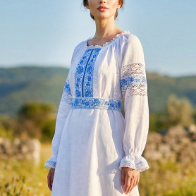 Выполненный в православном стиле сарафан с блузой «Русь» сшит из натурального хлопка в цветочек. Модель скромно декорирована однотонным воланом в цвет с основной тканью и тесьмой вьюнок. Можно носить под пояс и регулировать бретели по длине. Белая блузка из хлопка с длинным рукавом расшита натуральным нежным кружевом.