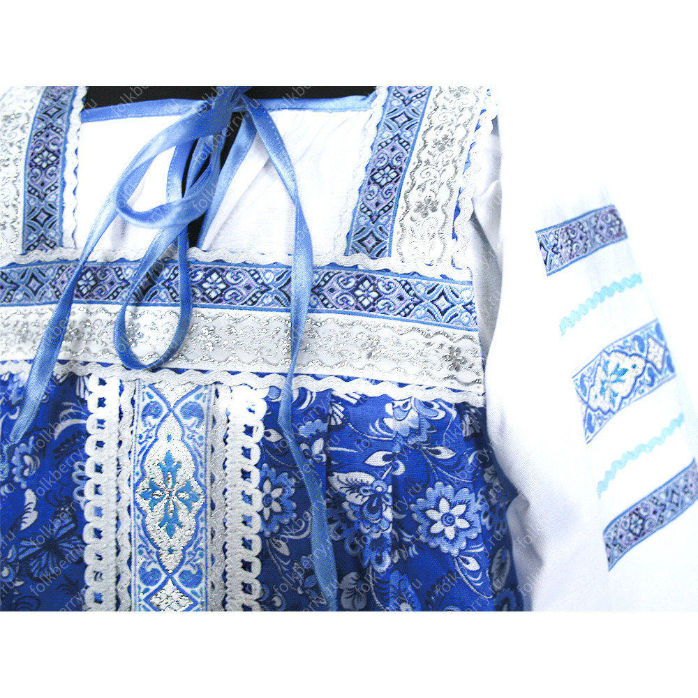 Длинный сарафан с блузой нежных пастельных цветов "Гжельские мотивы" выполнен в традиционном славянском стиле. Синий и голубой цвета - одни из любимых цветов русских девушек. Cарафан украшен жаккардовой тесьмой. Блуза выполнена из хлопка с красивыми вставками из декоративной жаккардовой тесьмы. Бретели сарафана регулируются по длине.