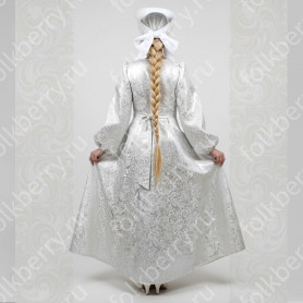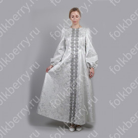 Сарафан состоит из кокетки спереди и сзади; бретелей, которые можно регулировать по длине; юбки-солнце средней длины с пышной оборкой. Сарафан выполнен из ткани габардин и украшен жаккардовой тесьмой, вьюнчиком.