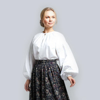 Блуза сшита из воздушной невесомой ткани – крепдешина. По индивидуальному заказу могут быть выбраны также атлас или шелк. Рукава пышные, на запястье воланы. Белоснежная блуза отлично сочетается с ярким сарафаном.