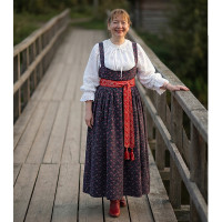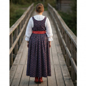 Юбка сшита из ажурного шитья, состоит из трех прямоугольных полотен, соединенных на поясе, украшена красным кружевом, бархоткой в тон, а также блестящей серебристой тесьмой.