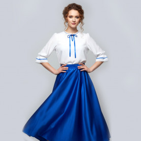 Костюм выполнен из габардина и красиво подобранного декора в золотистых цветах. Достоинства габардина в том, что он не мнется, не блестит, как атлас, ложится красивыми мягкими складками, цвет не выгорает. Юбка с оборкой, декор в золотистых цветах, по талии на двойной резинке. Блуза белого праздничного цвета, с баской, рукава расширены внизу, с манжетами. Сзади на блузе шнуровка. Она дает хорошую посадку по фигуре. Костюм предназначен для творческих сольных и коллективных театральных выступлений.